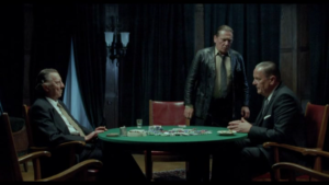 Cuerpos. Esta novedad encuentra su verosímil en el trabajo con los cuerpos. Los mismos no se interrelacionan orgánicamente, sino a través de posturas. Cuerpos como parte de la puesta en escena. En este punto, Kaurismaki parece encontrarse directamente con uno de sus referentes: Robert Bresson. El mismo, en sus Notas sobre el cinematógrafo, decía: “Si una imagen, contemplada aparte, expresa algo nítidamente, si conlleva una interpretación no se transformará al contacto con otras imágenes. Las otras imágenes no tendrán poder sobre ella y ella no lo tendrá sobre las otras imágenes. Ni acción, ni reacción. Es definitiva e inutilizable en el sistema del cinematógrafo”. Pero así como Bresson planteaba una vuelta al cinematógrafo para entrar en el alma de los personajes, el finlandés va todavía más atrás: su vuelta es a la fotografía. A Kaurismaki, el alma de los personajes no le interesa: su trabajo es sobre la epidermis de los mismos. Detiene, le pone un freno de mano a la ilusión de imagen en movimiento que tanto persigue el cine narrativo. En lugar de tensar el plano hacia la demanda del plano siguiente, invita al espectador a congraciarse con cuerpos en pose que muy frecuentemente detienen la situación, suministrando un modo expresivo de carácter no solo fotográfico, sino con efecto de gag. Mediante personajes parcialmente automatizados, la distancia promovida hacia ellos incluye el valor agregado de una forma de humor que se presenta como una de las marcas más reconocibles en su cine. Las situaciones más dramáticas del relato encuentran un atenuante en este recurso que atenta contra la identificación del espectador con las situaciones, aunque no promuevan una distancia tan grande como para alejarlo del todo. La búsqueda interior bressoniana, si bien planteaba la afección de la imagen no llegaba a comprometer la búsqueda de movimiento. Kaurismaki tampoco abandona dicha búsqueda, pero se autoriza a preguntarse sobre ella. Esto incluye la ausencia de conflicto en los personajes durante momentos centrales: en la escena del póker, Wikstrom no duda. Juega todo su dinero a riesgo de perderlo todo. En ningún momento su expresión devela conflicto: ni la mínima duda. Como es habitual en Kaurismaki, los personajes saltean el debatirse entre una decisión y otra; hacen caso omiso al momento del conflicto. Ese conflicto que suele potenciar dramáticamente la búsqueda de movimiento y la organicidad en los modos narrativos convencionales.