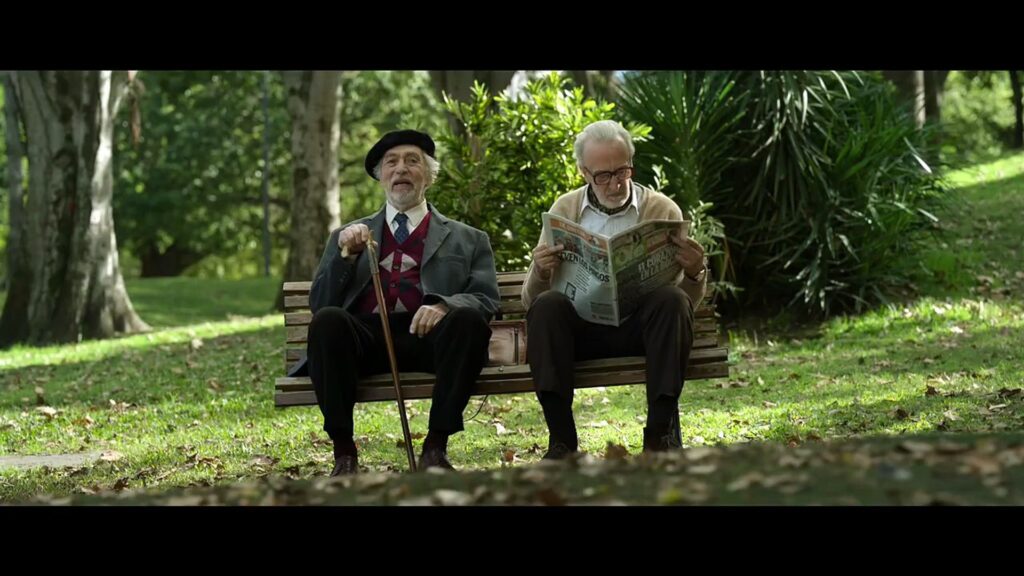 A partir de esos elementos hay que pensar a Parque Lezama como un engaño. Disfraza como cine algo que no deja de ser teatro –en tanto se optó por la literalidad de la traslación antes que a una adaptación real- y que, en el mejor de los casos, solo podría pasar por ser un ejercicio televisivo –la pregunta que queda flotando es si habrá sido pensada directamente para su estreno en la plataforma y posteriormente se decidió estrenarla en salas-. Divide el mundo de manare tajante y antagónica entre buenos –los protagonistas- y malos –esas diferentes caras del sistema que se le oponen: el pibe chorro, el dealer, el administrador del consorcio, la hija dueña de una inmobiliaria- e imagina que una plaza puede ser el territorio de las batallas, las que en general suelen jugarse en otros espacios. Pero también propone como tema central el paso del tiempo. No solo porque sus personajes principales tienen más de 80 años, sino porque remarca las consecuencias sobre los cuerpos –limitación de la fuerza, dificultades para movilizarse-. Pero en verdad, el tema que circula por toda la película es el del engaño –que era también el tema de El cuento de las comadrejas (2019), la anterior película de Campanella, oculto también detrás de lo temporal y el choque generacional-. Una simulación continua en la que cada personaje recrea para el otro un mundo idealizado, que se sitúa en el pasado y que se pretende reconstruir impoluto en el presente. Las personalidades que asume León, no solo ante Antonio Cardozo (Eduardo Blanco), sino ante los personajes que interactúan con ellos terminan por reforzar el carácter de artificio. La sensación es que toda la historia tiene como fin lograr que León convenza a Cardozo de que sus inventos no son un engaño sino, finalmente, la verdad (aunque la determinación termine siendo producto de un capricho antes que de una evolución narrativa de cierta lógica). Entonces, Parque Lezama hace chocar sus pretensiones de realismo con su determinación por establecer líneas de artificios que se van superponiendo unas sobre otras. Un espacio que deviene artificio que contiene una serie de diálogos y cruces maquetados y artificiales y ambos englobados en un artificio cinematográfico.