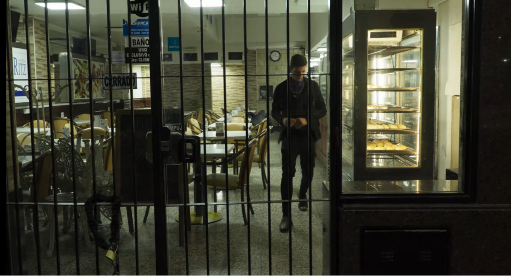 Un buen ejemplo es la apertura del video – así llama Lucia Seles a sus películas, y efectivamente asistimos a la sensación de estar ante una filmada en VHS, más que nada por la manipulación de la cámara en mano que por momentos se bandea y le brinda al cuadro una frescura artesanal. Ya de movida, el plano general de la Confiteria Ritz de la terminal de La Plata, en la provincia de Buenos Aires se deja oscilar en el movimiento, mientras en el margen inferior izquierdo se lee, con traduccion al inglés: “durante este video/de mi misma estaran/316 colectivos provinciales/x q soi y sere/como la billie holiday/at too many things/y tb queria avisar/my dreaming x recording/al dueño de las confiterias ritz/casi durmiendo in sus confiterias/y su agotamiento”.